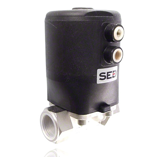 | - Edelstahl-Membranventil - Gewindemuffe 1/2"" - Kunststoff-Kolbenantrieb, pneumatisch betätigt NO - Steuerluftanschluss 90° zum Durchfluss |